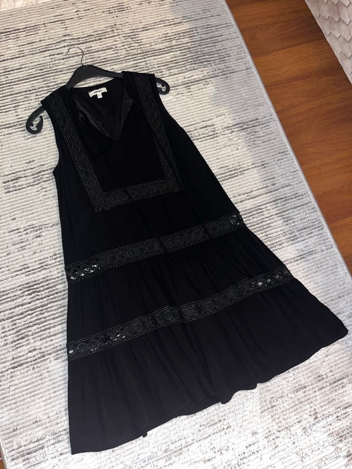 Dantel detaylı ve işlemeli desenlere sahip, kolsuz siyah elbise. V yaka ve bol kesimiyle bohem tarzını yansıtıyor. 1-2 kere giyildi 36 beden yazsada çok bol oldugu için 40 beden uyumlu