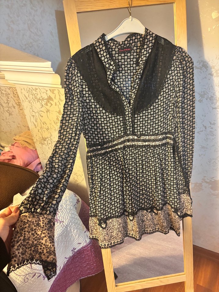 Siyah renkte, uzun kollu ve yüksek yakalı rahat kesim elbise. Dantel detayları ve desenli kumaşıyla günlük kullanıma uygundur. Bohem tarzını yansıtır.