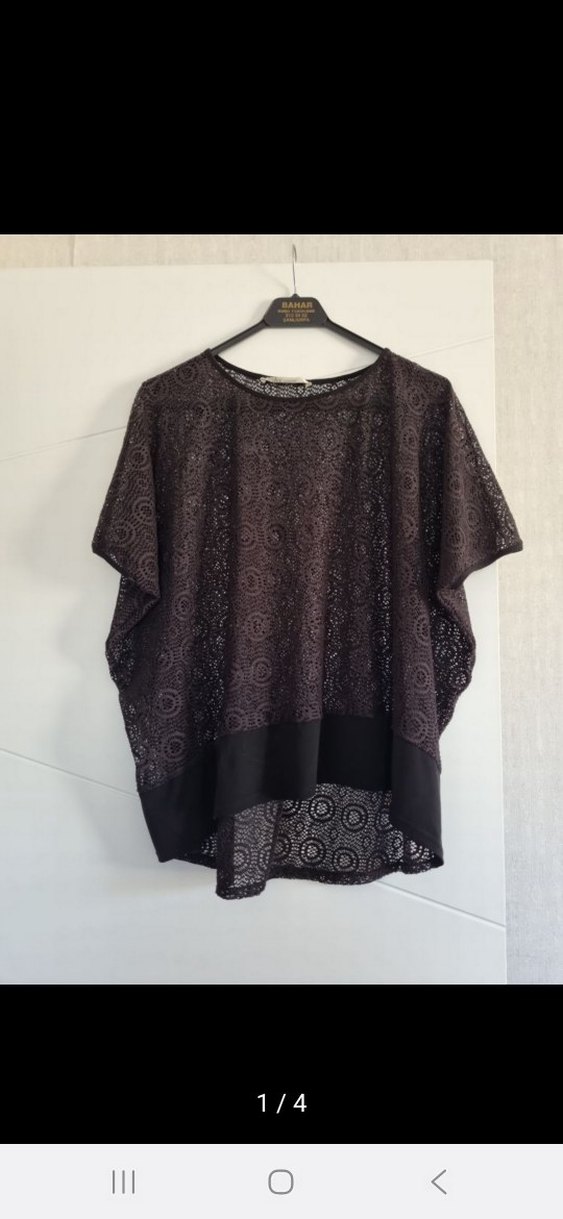 Kısa kollu, yuvarlak yakalı, bol kesim siyah kadın bluz. Dantel dokusu ve baskılı desenleriyle bohem tarzda, günlük kullanıma uygun.