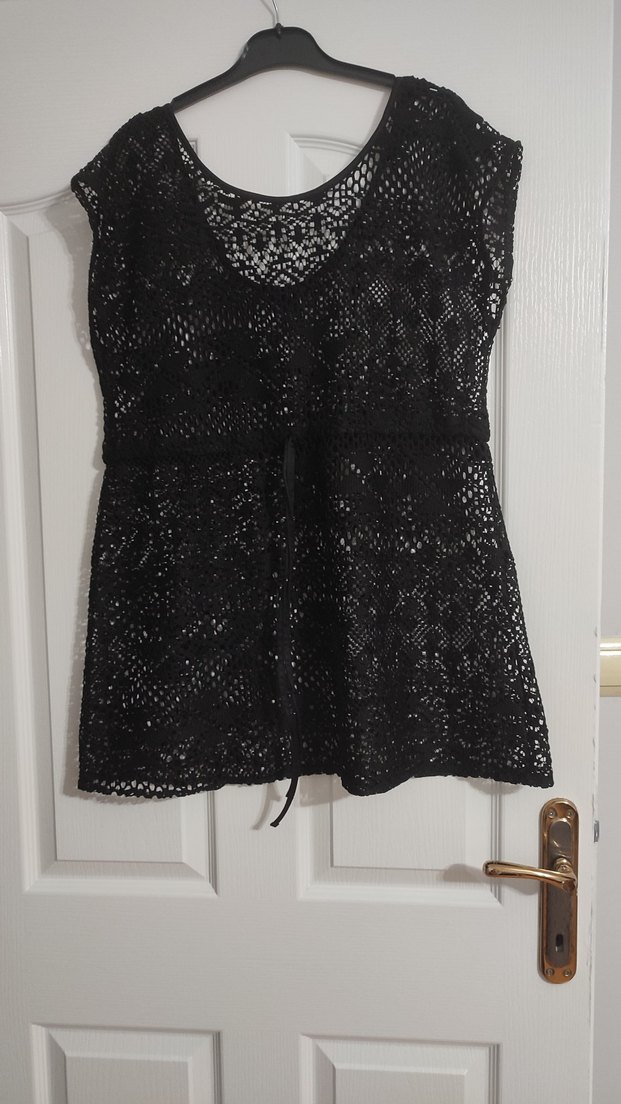 Dantel detaylı, V yakalı siyah kadın bluz. Kolsuz, bol kesim ve midi boyda, örme kumaştan, bohem gotik tarzda, açık hava kullanımı için uygundur. En50 boy 79
