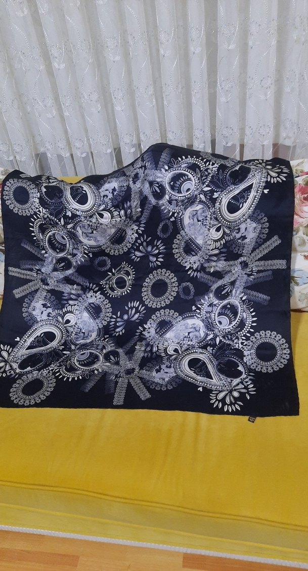 Yumuşak sentetik kumaştan, bohem tarzında siyah dantel detaylı, paisley ve çiçek desenli kadın fuları.