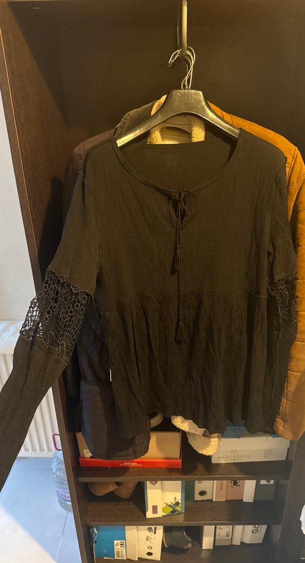 Uzun kollu, dantel detaylı siyah keten bluz. Bohem tarzda, yuvarlak yakalı ve günlük kullanıma uygun rahat kesim. İkili vericem uyguna