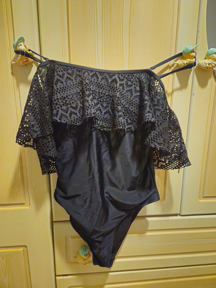 Dantel işlemeli, askılı ve fitted kesim siyah mayo, cesur bohem tarzı sunar, plaj için uygundur. shein ,hiç giyilmedi