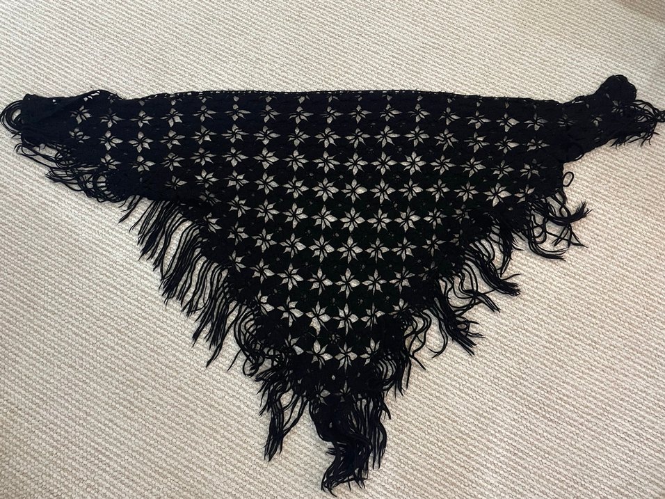 Dantel detaylı, püsküllü kenarları olan siyah triko şal. Bohem çiçek desenli, retro ve hippie tarzına uygun.