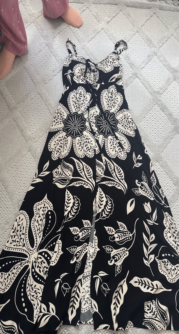 Kolsuz, V yakalı, dantel detaylı ve vücuda oturan siyah bohem uzun elbise, büyük desenli çiçek motifleriyle günlük kullanım için uygundur.
