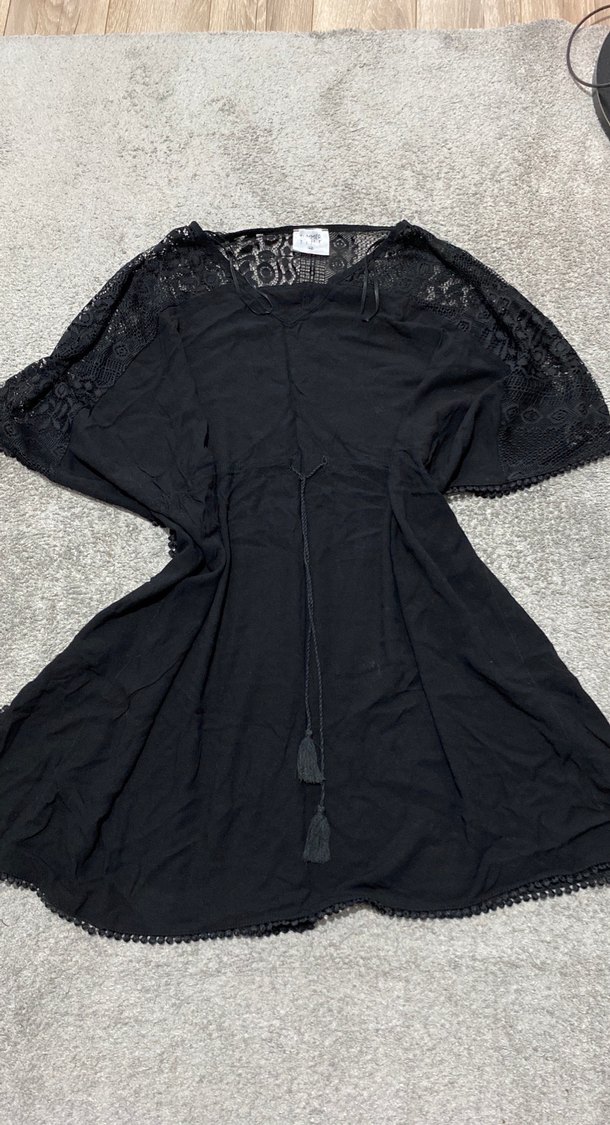 Dantel kısa kollu, nakış detaylı siyah uzun elbise. V yaka ve yumuşak sentetik kumaşa sahip, bol kesim günlük kullanım için uygun. Mayo üstüne giymek için almıştım birkaç defa giydim yeniden farksızdır