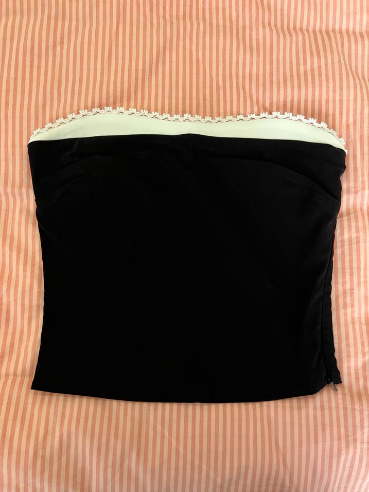 Üst kısmında ince dantel detayı bulunan siyah, yan tarafında fermuarı olan bustiyer. Kumaşı düzgün ve vücuda oturur.