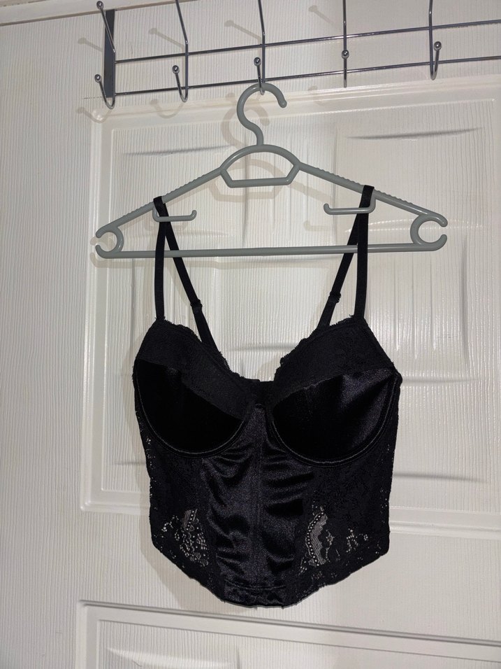Dantel detaylı, saten görünümlü siyah gotik stil bustiyer. İnce askılı ve vücuda oturan kesimiyle günlük kullanıma uygundur beden ölçüsü 75C