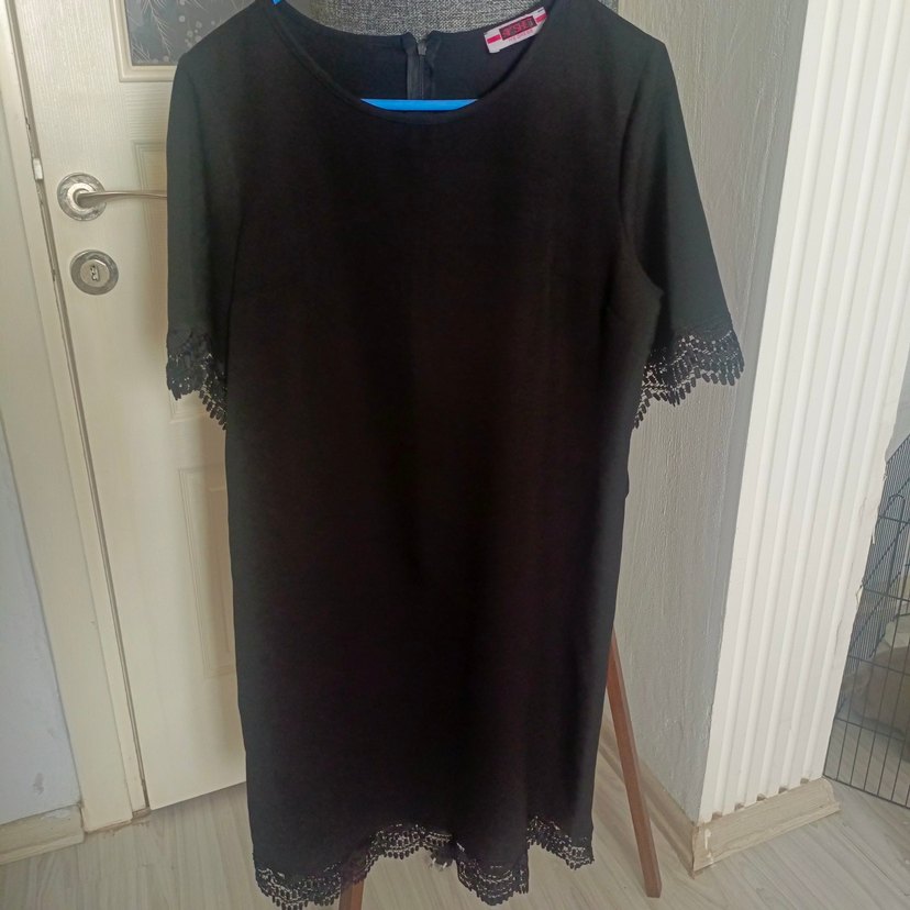 Dantel detaylı, kısa kollu, yuvarlak yakalı siyah elbise. Rahat kesimi ve yumuşak sentetik kumaşıyla günlük kullanıma uygundur.