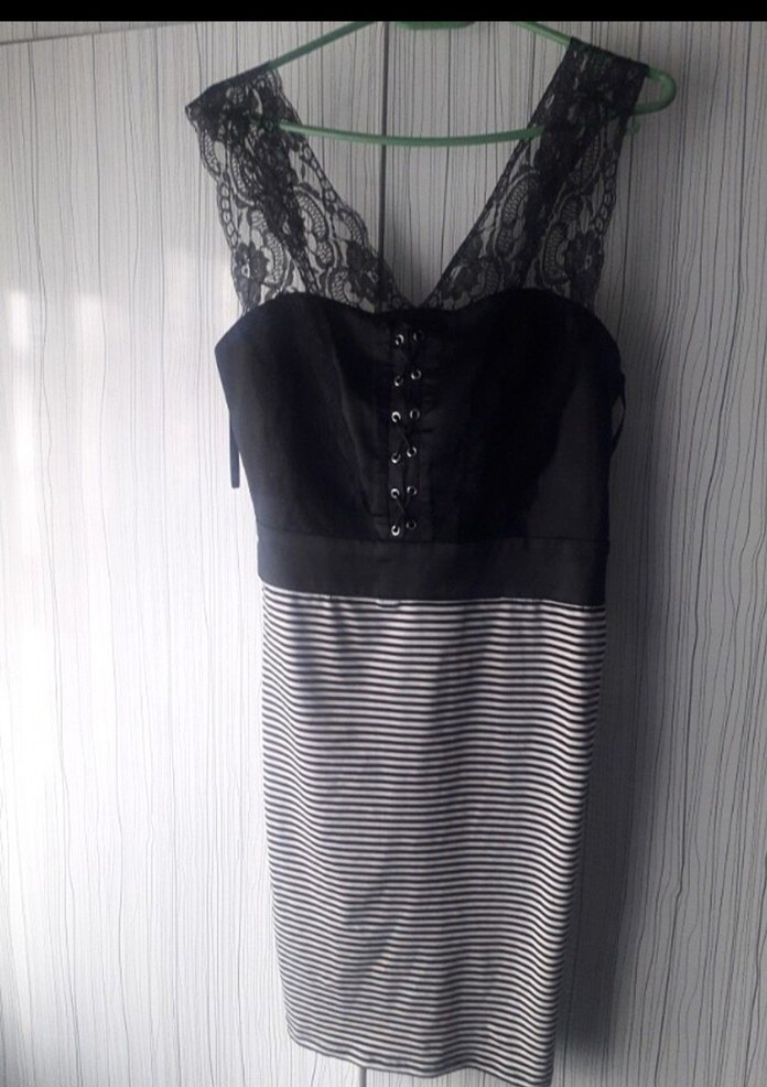 Dantel detaylı, straplez kalp yaka ve çizgili desenli siyah beyaz dizüstü elbise, İnce rahat bir kumaşı var yaz akşamları için kullanılabilir. Alt: polyesterımsı üst:saten ve bağcıklıdır. Hiç giymedim yeni. S-M uyumludur. TAkAS YAPILIR