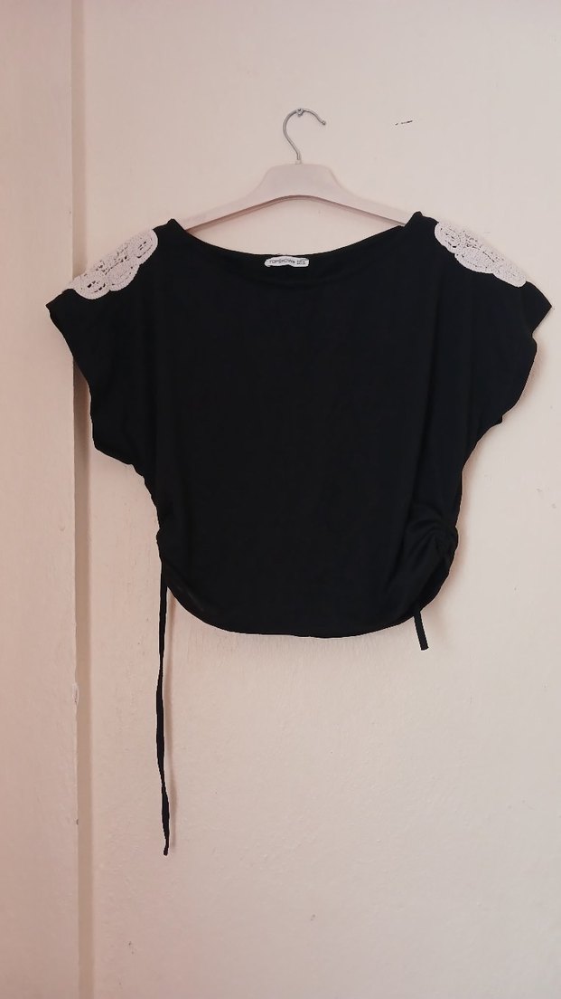 Dantel detaylı omuzlarıyla siyah, kısa kollu, yuvarlak yakalı crop bluzu. Rahat kesimi ve kısa boyuyla, yumuşak örme kumaştan günlük kullanıma uygun.