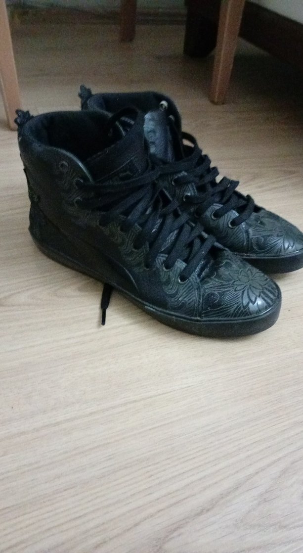 Dantel detaylı, desenli siyah deri goth sneakers, stiletto topuklu, romantik akşamlar için uygun.