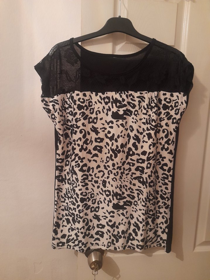 Dantel detaylı, kısa kollu, yuvarlak yakalı kadın bluz. Siyah ve hayvan desenli,40-42 bedene uygun
