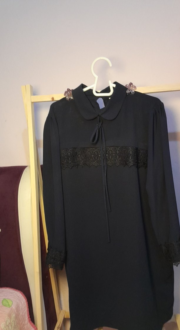 Dantel detaylı, gömlek yakalı ve uzun kollu siyah bluz. Salaş kesim ve ipeksi dokusu 38 beden koyu lacivert
