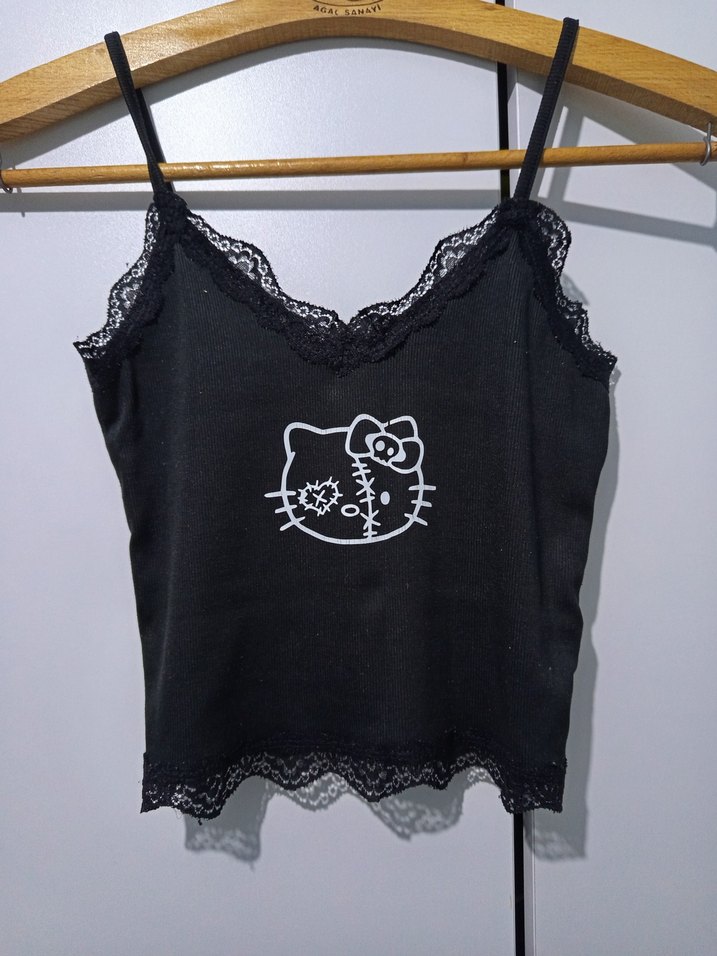 Siyah askılı büstiyer,dantel detayları ve nakışlı gotik hello kitty desenine sahiptir. V yaka ve fit kesim, likralı,yumuşak,triko kumaştandır.çok az kullanıldı ergenlik zamanımda 5-6 kere giymişimdir.temiz kullanıldı herhangi bir kusuru yoktur.