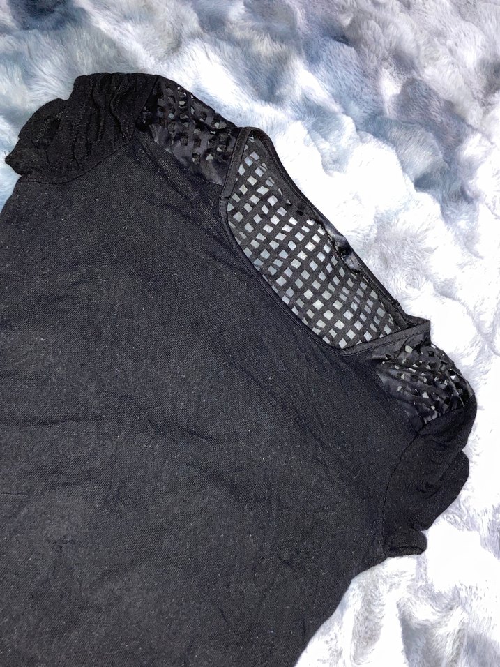 Siyah, vücuda oturan kadın bluz, tekne yaka ve kısa kollu, dantel detaylarıyla. Yumuşak sentetik kumaştan, günlük gotik tarz için uygun.
