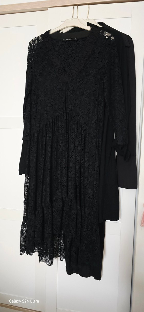 Dantel detaylı, desenli tekstil kumaştan siyah uzun elbise. Notlu yaka ve uzun kollu, geniş kesim ile ofis için uygun goth tarzı.