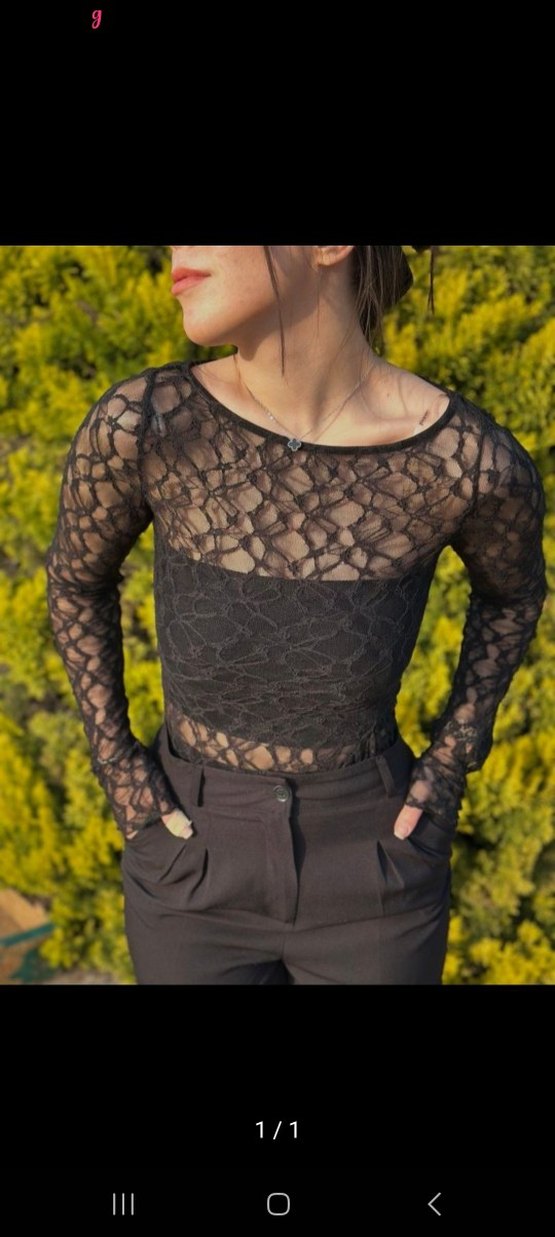 Siyah dantel kumaştan, yılan deseniyle gotik tarzda, oturan kesime sahip bluz. Yuvarlak yaka ve uzun kolludur, cesur ve günlük kullanım için uygun.