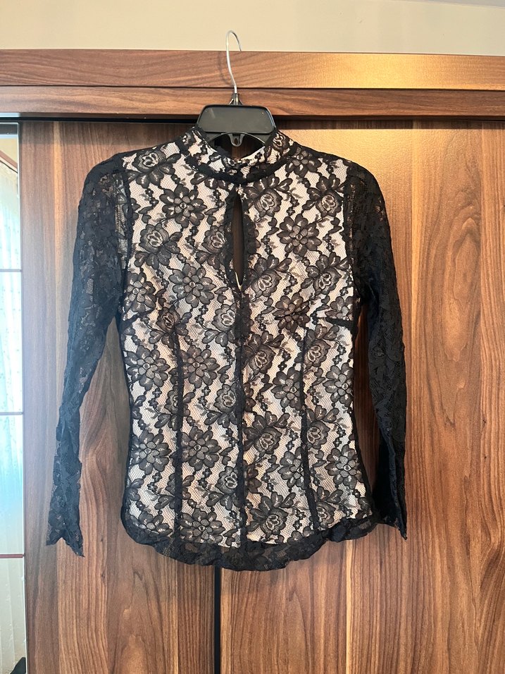 Dantel kumaş ve baskılı gotik desenlere sahip, uzun kollu, yüksek yakalı, vücuda oturan siyah bluz. Ofis için klasik ve zarif tarzda uygun.