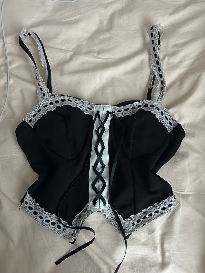 Beyaz dantel detaylı, işlemeli siyah gotik stil büstiyer. İnce askılı, halter yaka ve vücuda oturan kesime sahip.