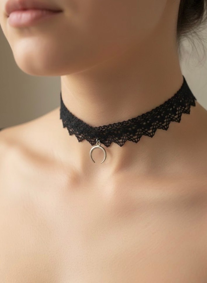 Siyah dantel detaylı choker, ay figürü detayıyla hareketlendirilmiştir. Şık ve zarif bir görünüm için idealdir. Dantel genişlik 25mm. Uzunluk 35cm. Uzatma zinciri mevcut #choker #dantelchoker #nljhilal #gotiktakı N17