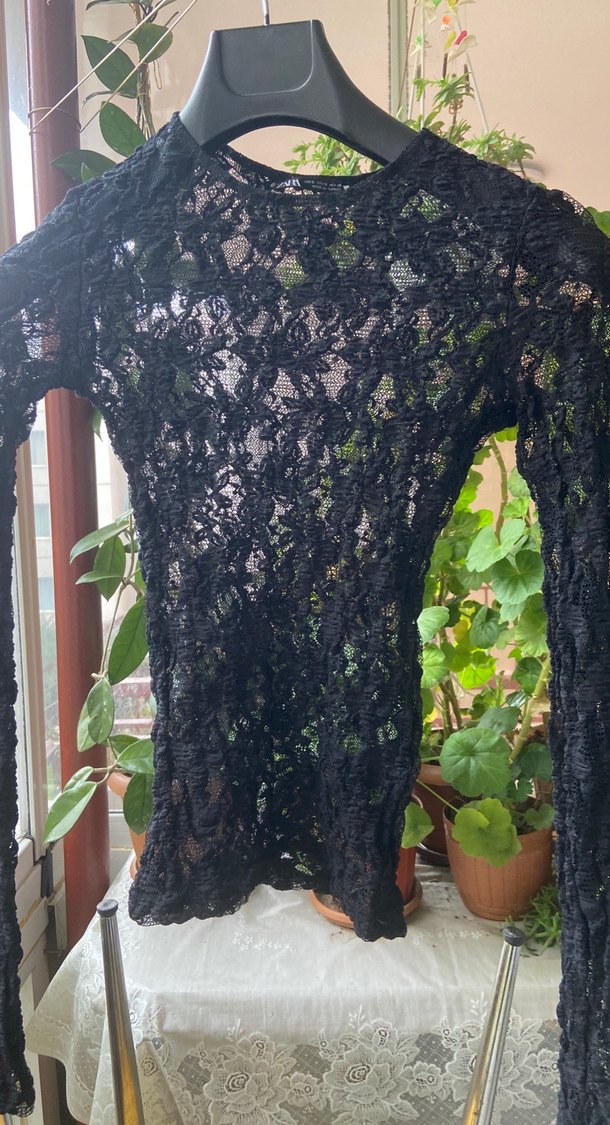 Fitted kesim, yüksek yakalı, uzun kollu siyah dantel detaylı örme bluz, gotik parti tarzı için uygundur. Dar kalıptır XS bedene uygundur.