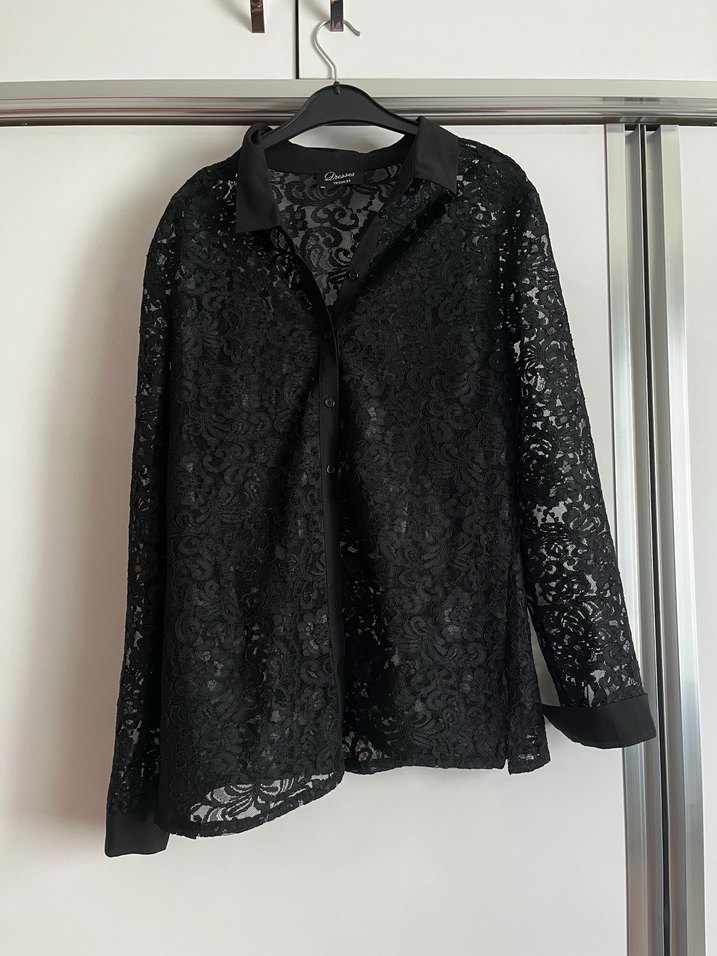 Siyah dantel detaylı, notched lapel yakalı, uzun kollu, bol kesim gotik tarzda kadın bluz. Sentetik kumaştan, ofis kullanımı için uygun, cesur bir görünüm sunar.