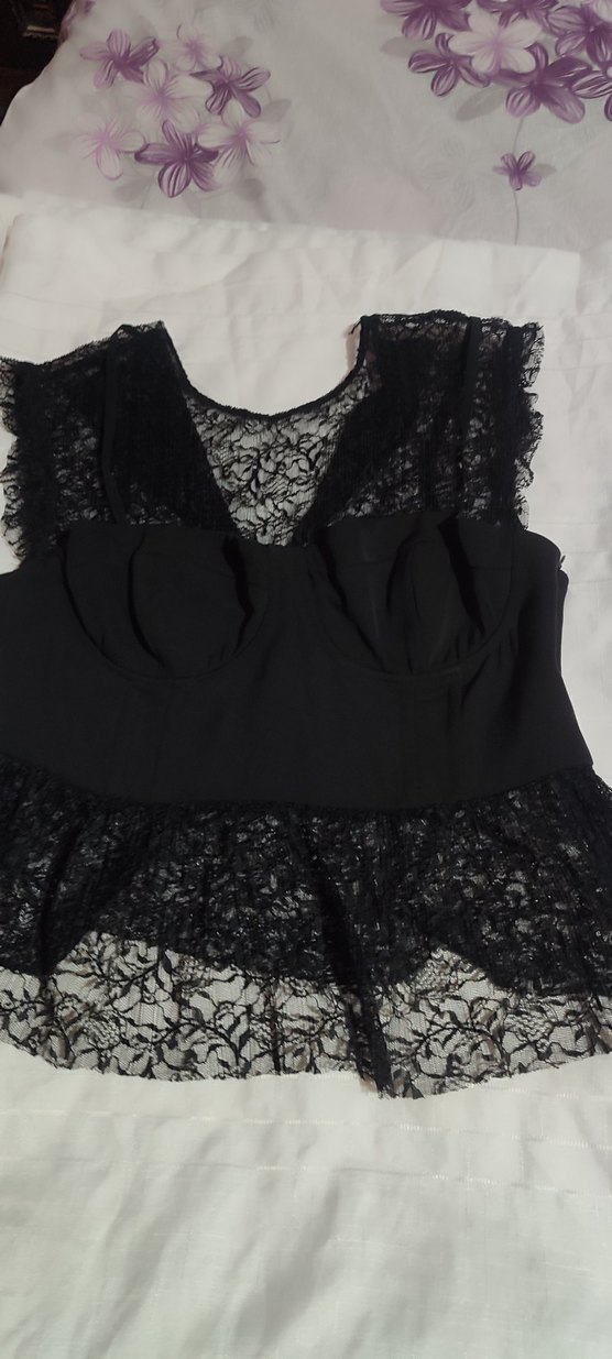 Dantel detaylı, straplez yaka ve kolsuz siyah büstiyer. Gotik tarzda, parti için uygun, sıkı kesim ve sentetik kumaştan yapılmıştır.