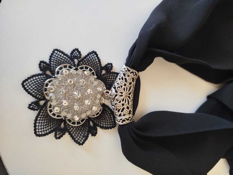 Yumuşak şifon kumaştan, dantel detaylı ve süslü gümüş aksanlı siyah kadın fular, gotik ve bohem tarzları yansıtır. ürün iğne oyasından yapılmış el yapımıdır