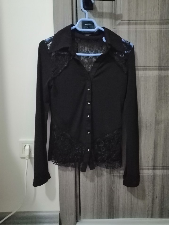Düğmeli, uzun kollu, yakalı ve dantel detaylı siyah gotik kadın gömlek. Sentetik kumaştan, ofis için uygun şık tasarım.