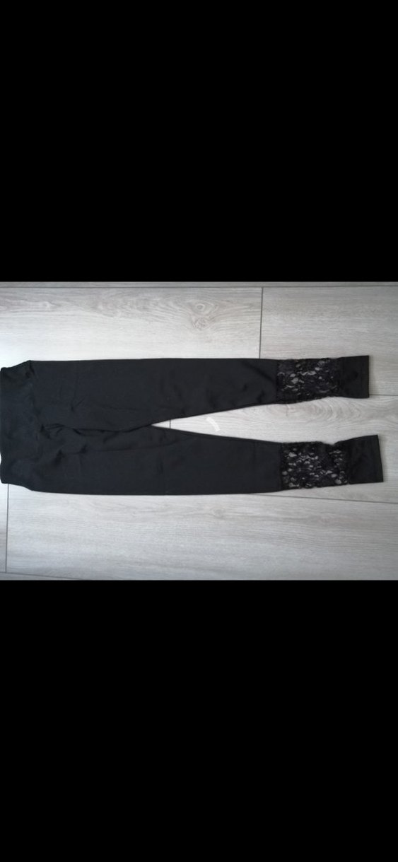 Diz altı dantel detaylı, siyah gotik tarzda, sentetik kumaştan yapılmış dar kesim kadın tayt.