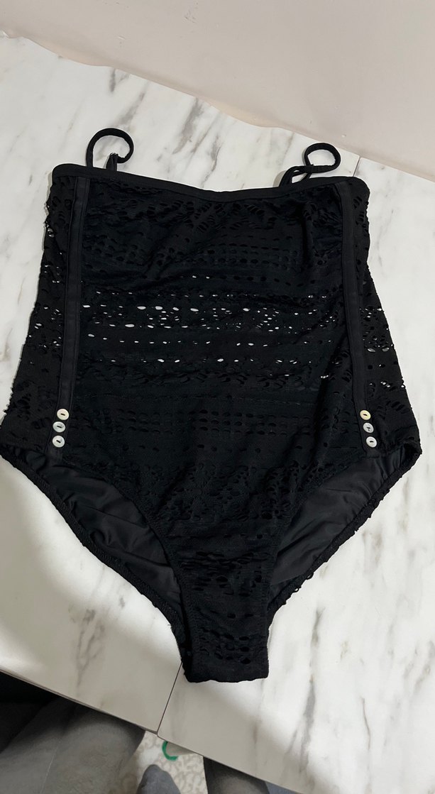 Dantel detaylı, askılı ve siyah renkte, gotik tarza uygun, midi boy ve düğme detaylı kadın mayosu. 40 beden straplez