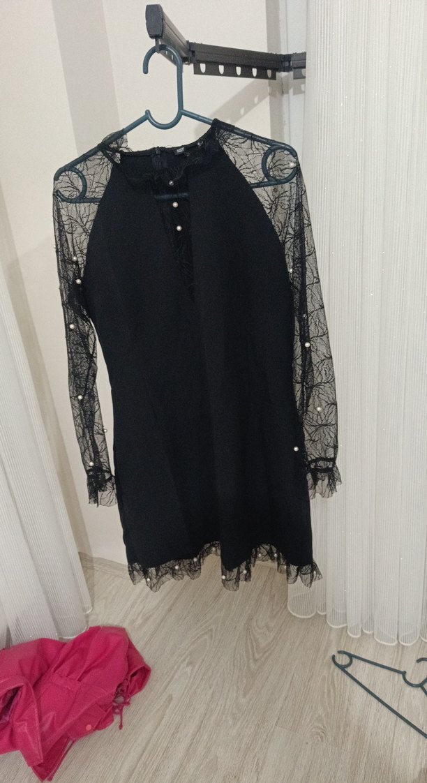 Siyah midi gece elbisesi, dantel uzun kollu ve yüksek yakalı, vücuda oturan kesimiyle gotik tarzda. Günlük kullanıma uygun şık bir seçenek.