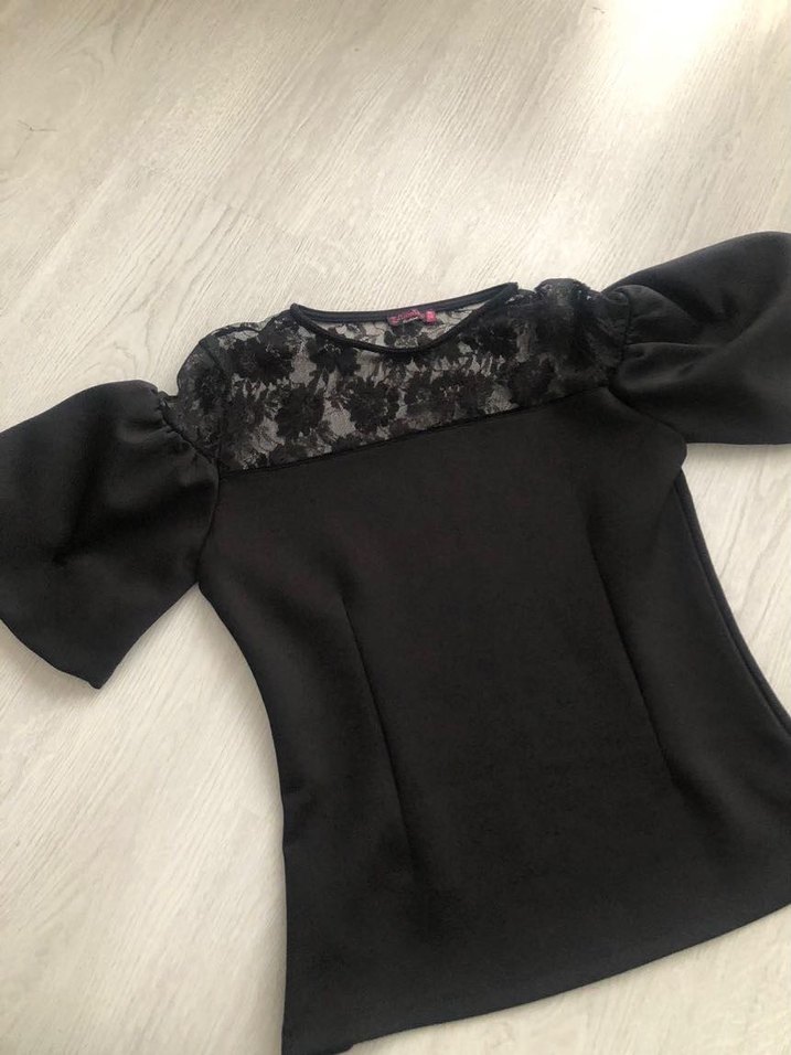 Dantel detaylı, kısa kollu, yuvarlak yakalı siyah gotik mini bluz. İnce ve yapay kumaştan, klasik şıklık için uygun. M/38 bedendir