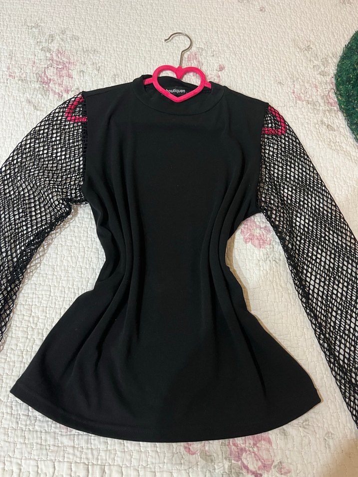 Dantel kol ve nakış detaylı, siyah, gotik stil uzun kollu, dar kesim bluz. Rahat ve şık günlük kullanım için uygundur.