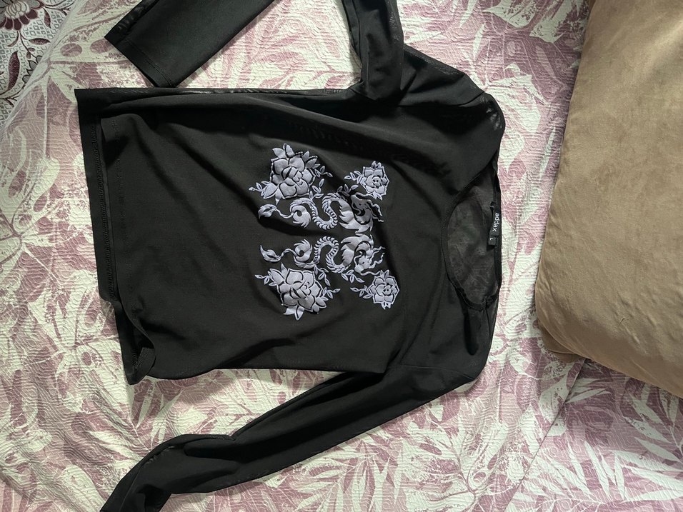 Dantel detaylı, uzun kollu, siyah gotik desenli ve dar kesim bluz. Sentetik kumaştan, midi boyda ve günlük kullanıma uygun.