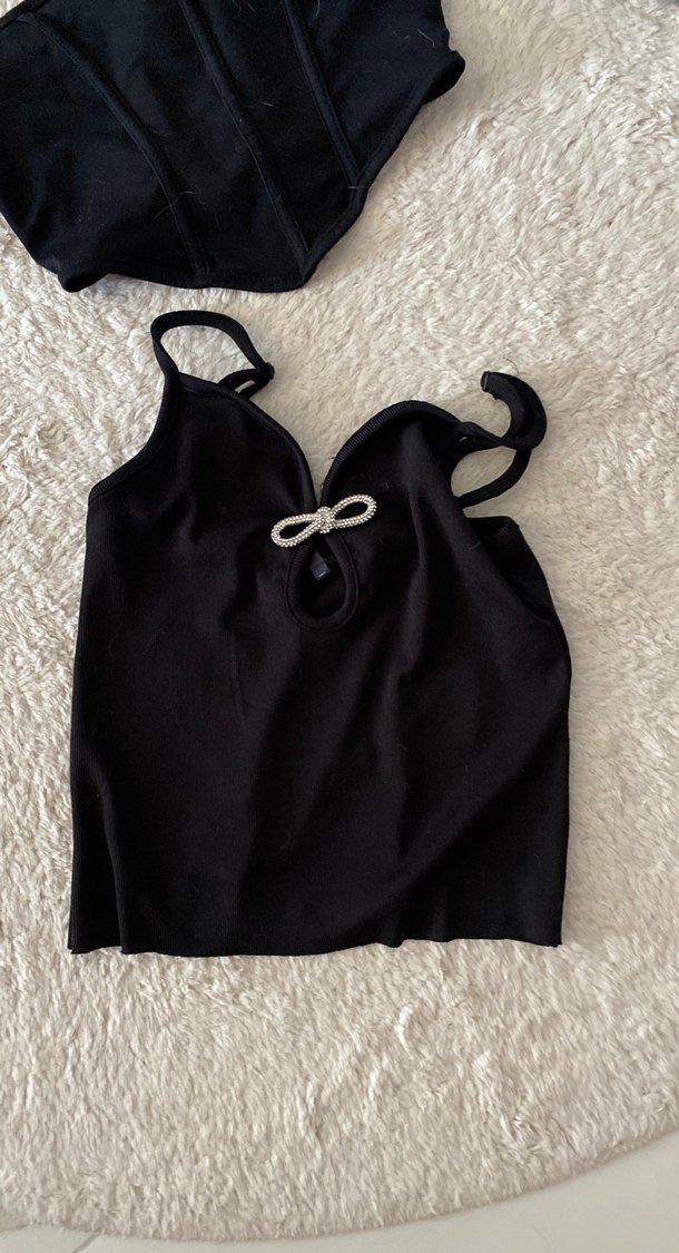 Dantel detaylı, siyah halter yaka ve askılı, mini boy dar kesim atlet. Minimalist ve cesur gotik tarz için uygun.