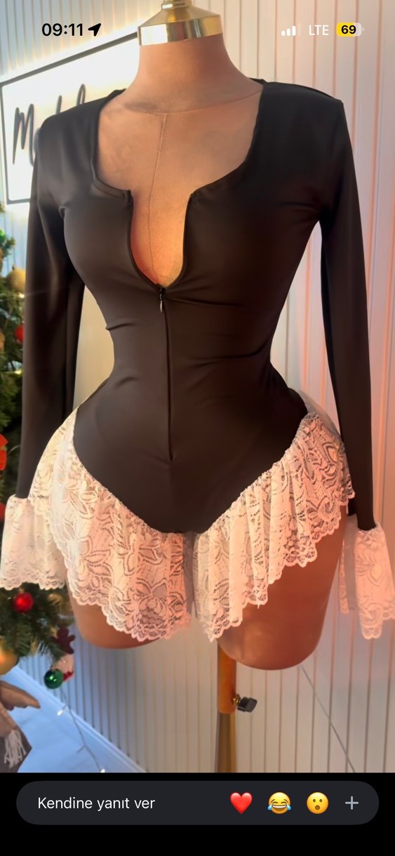Siyah, vücuda oturan hemşire korsesi, midi boyda, derin yaka ve etek ile manşetlerde beyaz dantel detaylara sahiptir. Önünde fermuar bulunur.