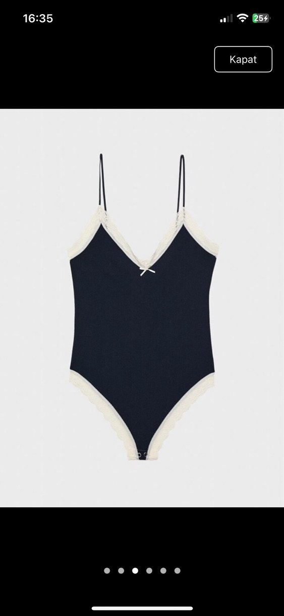 İnce askılı ve dantel detaylı siyah, vücuda oturan mayo. Normal midi boyda, desen içermeyen cesur ve Paris esintili tasarım.