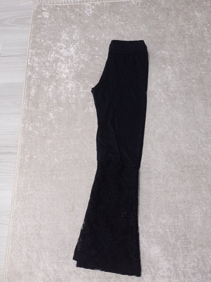 Dantel detaylı, sentetik kumaştan yapılmış siyah, ispanyol paça kesim, dar kesim kadın pantolon. Günlük rahat kullanıma uygun gotik tarz.