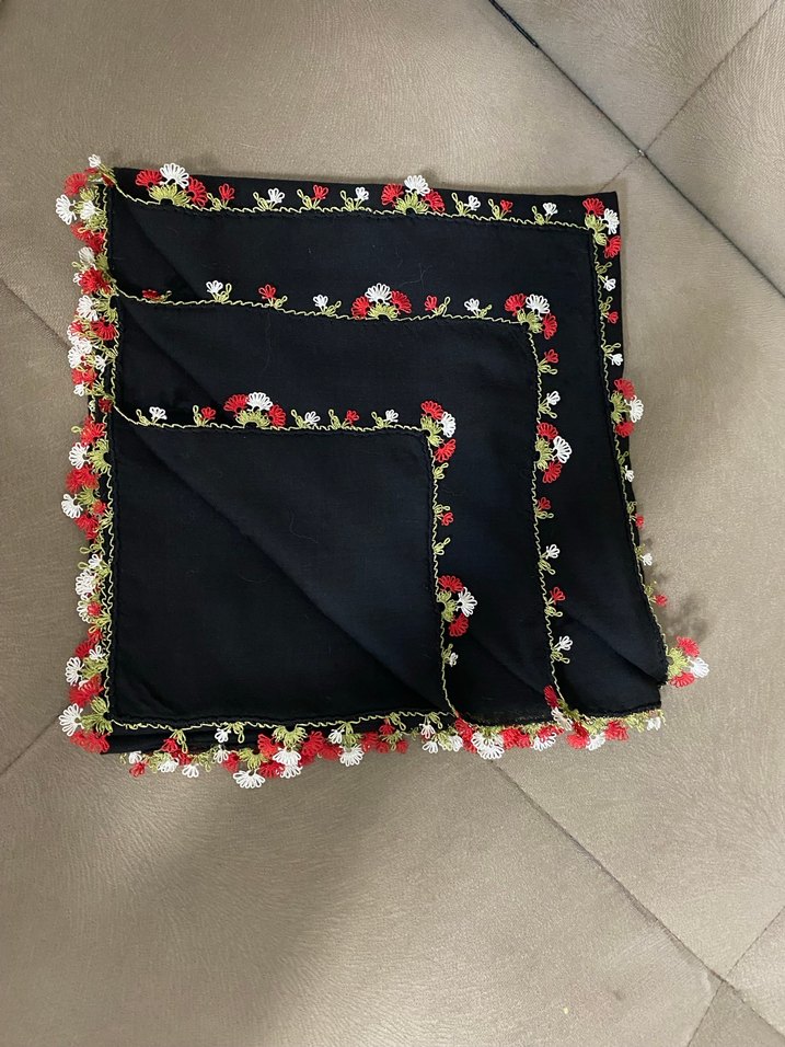 Kenarları kırmızı ve beyaz çiçekli dantel detaylı, yumuşak dokulu siyah kadın başörtüsü. Mütevazı ve bohem tarzı yansıtır.