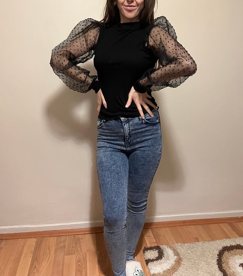 Dar kesim siyah bluz, uzun tül kolları ve puantiyeli dantel detayları ile midi boyda, yuvarlak yaka ve denim kumaştan, günlük sokak stili için uygun.