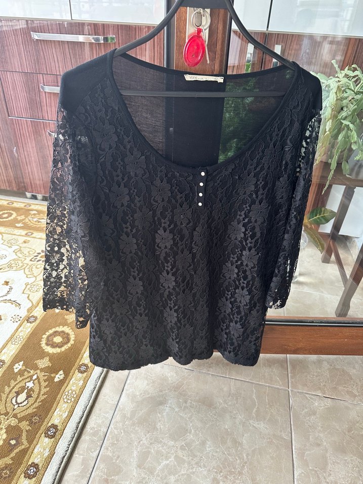 Yumuşak triko kumaştan, uzun dantelli kollu ve yuvarlak yakalı, bol kesim siyah kadın bluz. Trendy günlük kullanıma uygundur.