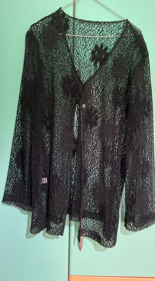 Siyah dantel detaylı hırka, uzun kollu ve notlu yaka ile bol kesimdir. Midi boyu, gotik tarzda bohem ve retro havası verir, günlük kullanım için uygundur.