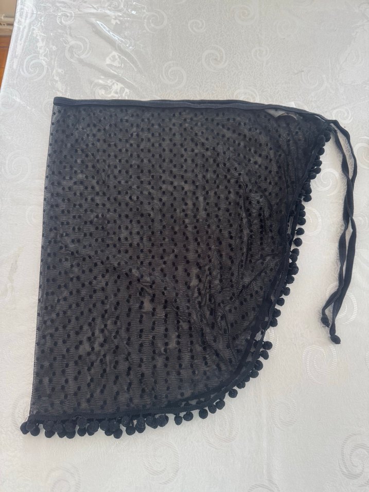 Dantel detaylı, siyah kadın pareo, yumuşak sentetik kumaştan ve ince noktalı desene sahip, bohem ve goth tarzına uygundur.