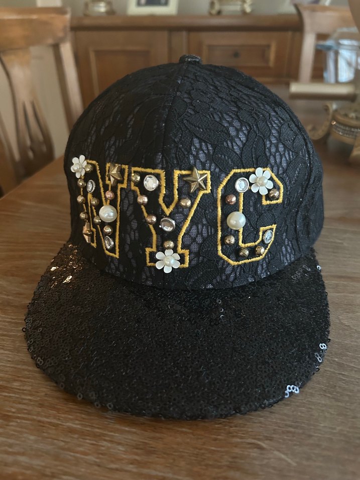 Siyah kadın şapka, dantel kaplama ve "NYC" harflerinde inci ve çiçek süslemeleri içerir. Payetli siperliğiyle retro bohem tarzı sunar. Bedeni standarttır.