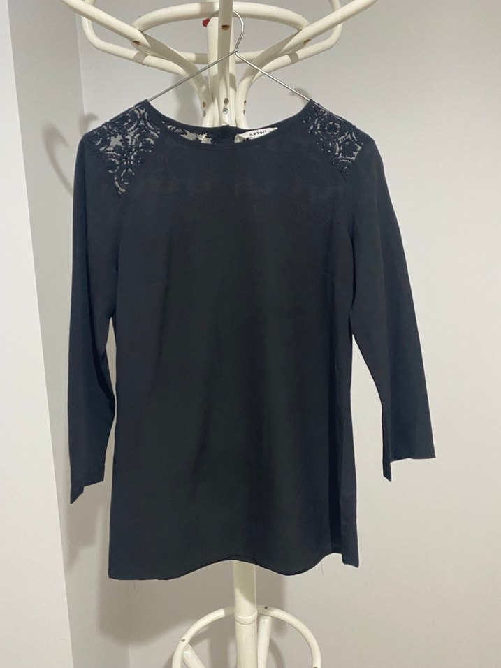 Uzun kollu, bisiklet yaka siyah süet bluz, omuzlarda dantel işlemeli detaylara sahip. Rahat kesimli ve midi boyda, ofis kullanımı için uygun.