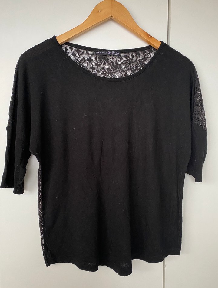 Kısa kollu, dantel detaylı siyah bluz. Yuvarlak yaka ve bol kesimle günlük kullanıma uygun.
