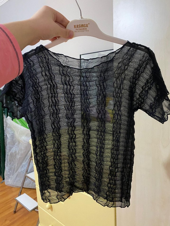Dantel detaylı, kısa kollu, bisiklet yaka ve keten kumaştan yapılmış siyah bol kesim bluz. Günlük kullanıma uygun goth tarzında. s m beden uyumlu #zara degildir