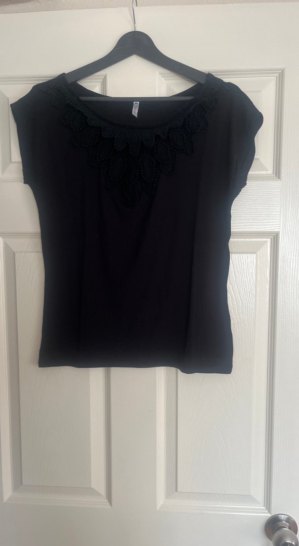 Siyah, kısa kollu, yuvarlak yaka ve dantel işlemeli detaylara sahip bluz